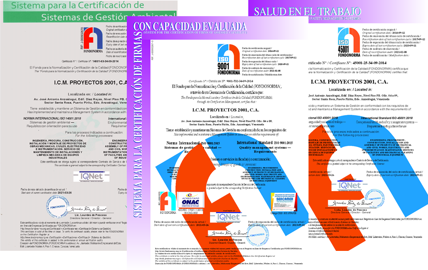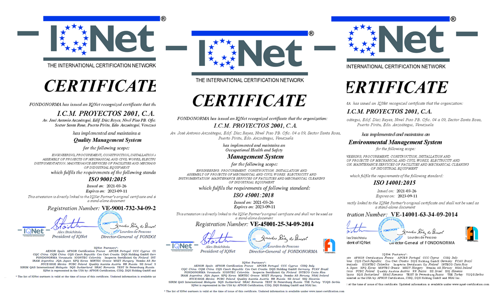 Servicos Certificados: Ingenieria, Procura, Construcción Instalación y Montaje de Proyectos de Obras Mecánicas, Civiles, Electricidad e Intrumentación. Servicios de Mantenimiento de Instalaciones y Limpieza Mecánica de Equipos Industriales. ICM Proyectos 2001, C.A., Es una Empresa Venezolana, dedicada a prestar servicios de Mantenimiento de Plantas Industriales (Paradas de Plantas), construcción, izaje, montaje de equipos estáticos y rotativos, tuberías, construcción civil, mecánica, obras de gran magnitud en la modalidad de IPC, suministro de personal (directo e indirecto), suministro y alquiler de maquinarias para la construcción civil y mecánica, instrumentación y electricidad a distintos sectores industriales de Venezuela, teniendo una vasta experiencia en la industria petrolera y petroquímica Venezolana. Utilizando como herramienta gerencial las normas ISO 9001:2015, ISO 14001:2015 Y ISO 45001:2018.